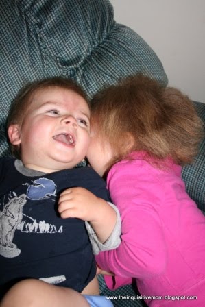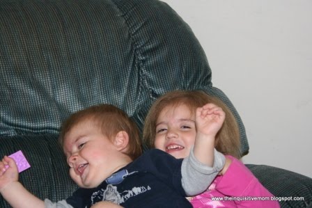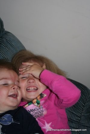 We were sorting toys while playing today and it worked for awhile until the kids grew tired of it. They decided to head into Ella’s room for a change of scenery and I stayed in the family room to finish picking up a bit. Things were quiet for awhile, so I decided not to mess with a good thing. Then I heard delighted giggles and guffaws emitting from the doorway and had to witness the fun for myself.