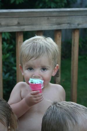 Thanks for the video fix … it is adorable. Fun song and adorable pics. He grew up a LOT in his looks — happens *just*like*that! I love how the pics capture the essence of summer – family, barefoot in the grass, dirty, ice cream, tan, etc.