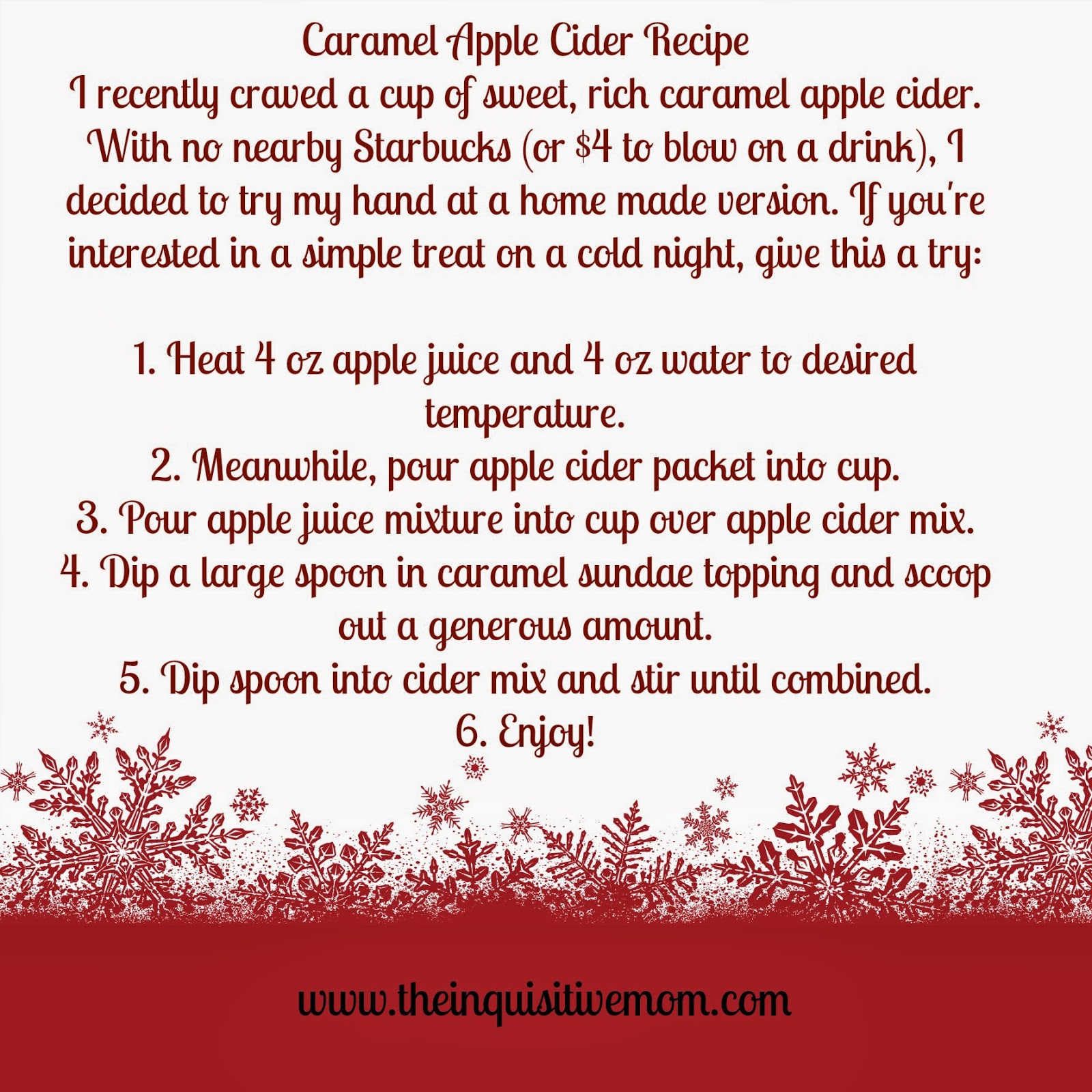 I recently craved a cup of sweet, rich caramel apple cider. With no nearby Starbucks (or $4 to blow on a drink), I decided to try my hand at a home made version. Easy-peasy. If you’re interested in a simple treat on a cold night, give this a try: