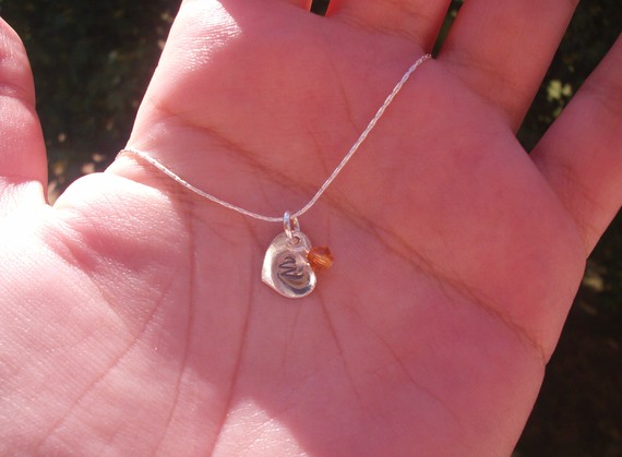 When Jaclyn, the face behind the Jaclyn1423 Etsy Shop, sent me a link to this delicate, sterling creation, my whole perspective on the “mommy necklace” changed. Jaclyn decided to create her own Mommy Necklace for a good friend expecting her first baby. She stamped an initial on a tiny sterling heart, added a Swarovski crystal in the baby’s birthstone, then hung the charms from a lovely 18-inch sterling silver chain. The result was a sentimental, but hip, and versatile piece.