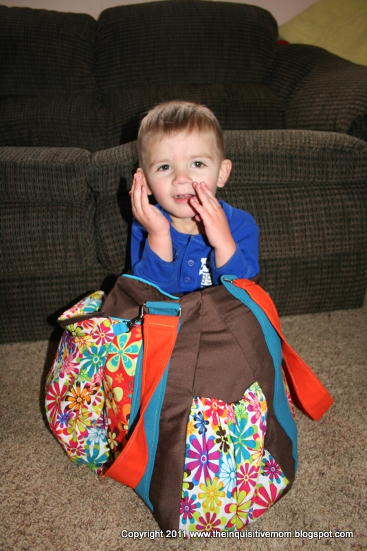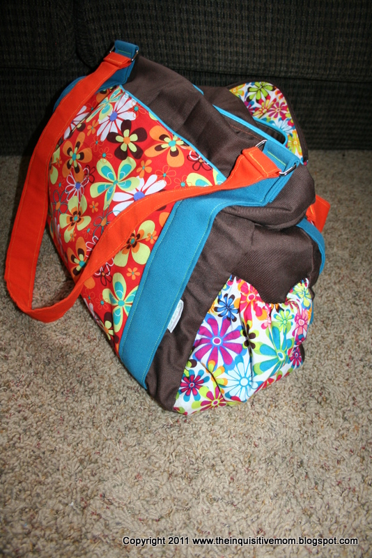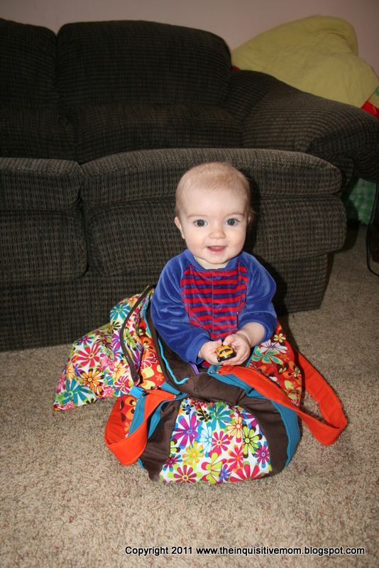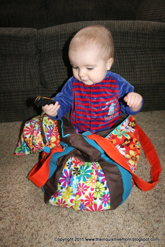 Pockets: This bag had 9 pockets – 4 on the outside and 5 on the inside, one zippered. I don’t use bottles or cups for baby yet and Ezra doesn’t need to travel with a sippy cup, so I like to use the two outer bottle pockets for tissues, my cell phone, and keys. The big outer pockets (hidden behind your panels of fabric) are great for slipping a shopping list, notebook, or baby’s hat – anything you need quick access to. The inside pockets are cavernous and I slip in toys, baby books, snacks, and sometimes my wallet. They are so big in fact, I’d actually like to see one split in two to keep smaller items such as pacifiers, baby asprin, and hand sanitizer. The zippered pocket is great for mom items such as lipgloss, keys, tampons, and gum.