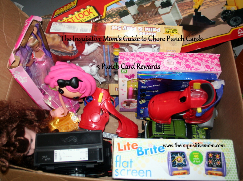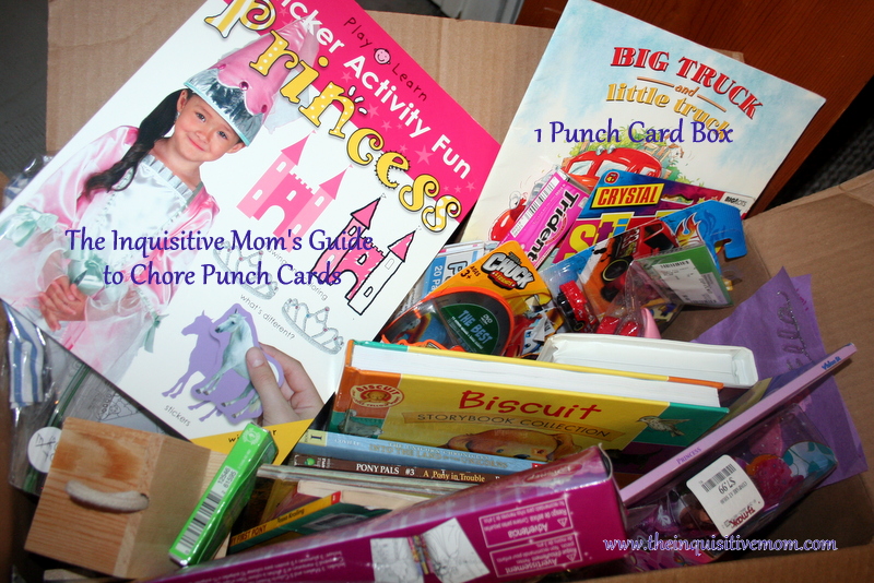 We have 2 boxes right now that equal 1 and 3 punch cards. Why not 2? Well, it’s my intention to create a 2 punch card box, but our kids aimed for bigger prizes at first and so 3 felt right. You can also include things such asWe’ve been using this system for at least a month now and it’s the best one we’ve tried so far. I was especially excited the first time my daughter earned one punch card, chose from the first box, then changed her mind. She really wanted to earn a Lolliloopsy doll I found for a steal after Christmas and held out to earn 3 punch cards for this reward.