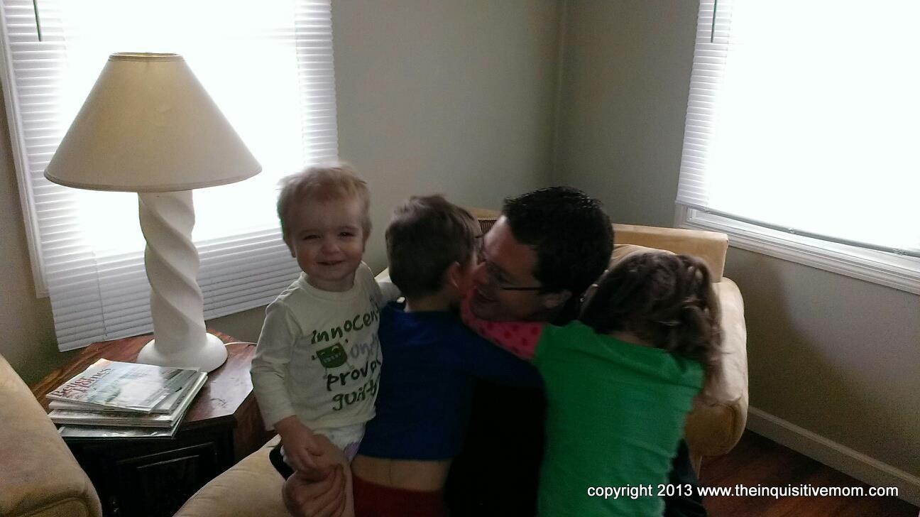 He’s like a superstar when he comes home. Everyone drops what they’re doing, running, and calling Dad! Despite long, exhausting days of studying, he doesn’t look for “me,” time, but enthusiastically hugs these kids and asks about their day.