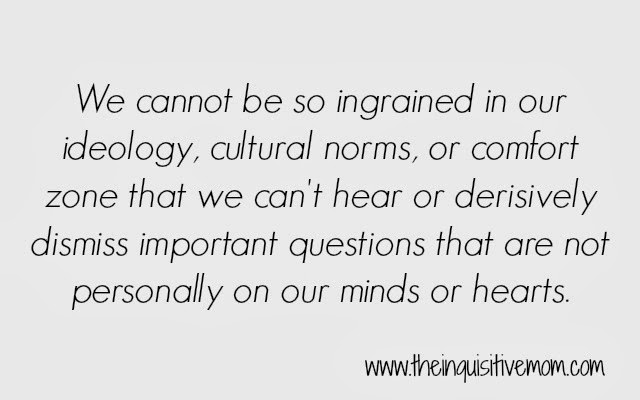 Over the past few weeks, the importance of creating an environment where questions can be safely and sincerely asked has resonated with me. I’ve considered how this applies to my home life, thinking of how often my children ask a questions that surprise me, challenge the way I view the world, or cause me to reconsider my way of viewing a situation. I’ve thought of online political debates, often full of statements and opinions, but stymied by a lack of openness to sincere questions and a lost ability to even formulate them.