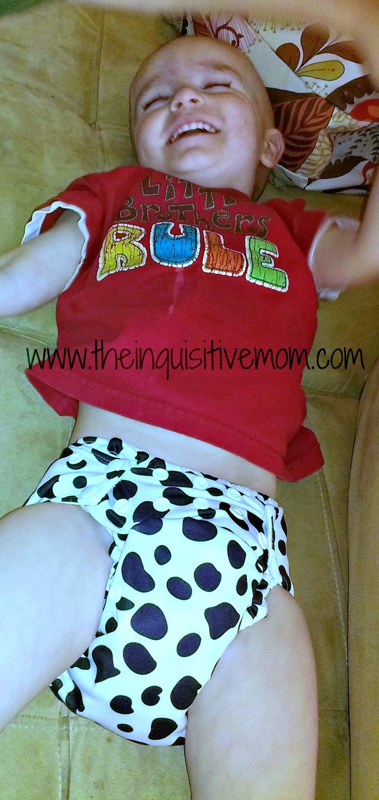 Fit: We all know that a great print like Moo Rockin’ Cow can only take a diaper so far, though. For me to keep grabbing a diaper from my eclectic stash, it needs to have fashion and function. The Bee Changed Pocket provides a consistent, comfortable, leak-free fit on my trim 2 year-old every time we use it. We place the snaps on the second setting and the diaper wraps around him without the gaps we sometimes find at the top of pockets. The wrap and go feature also makes it clear that this diaper could fit from birth to potty training.